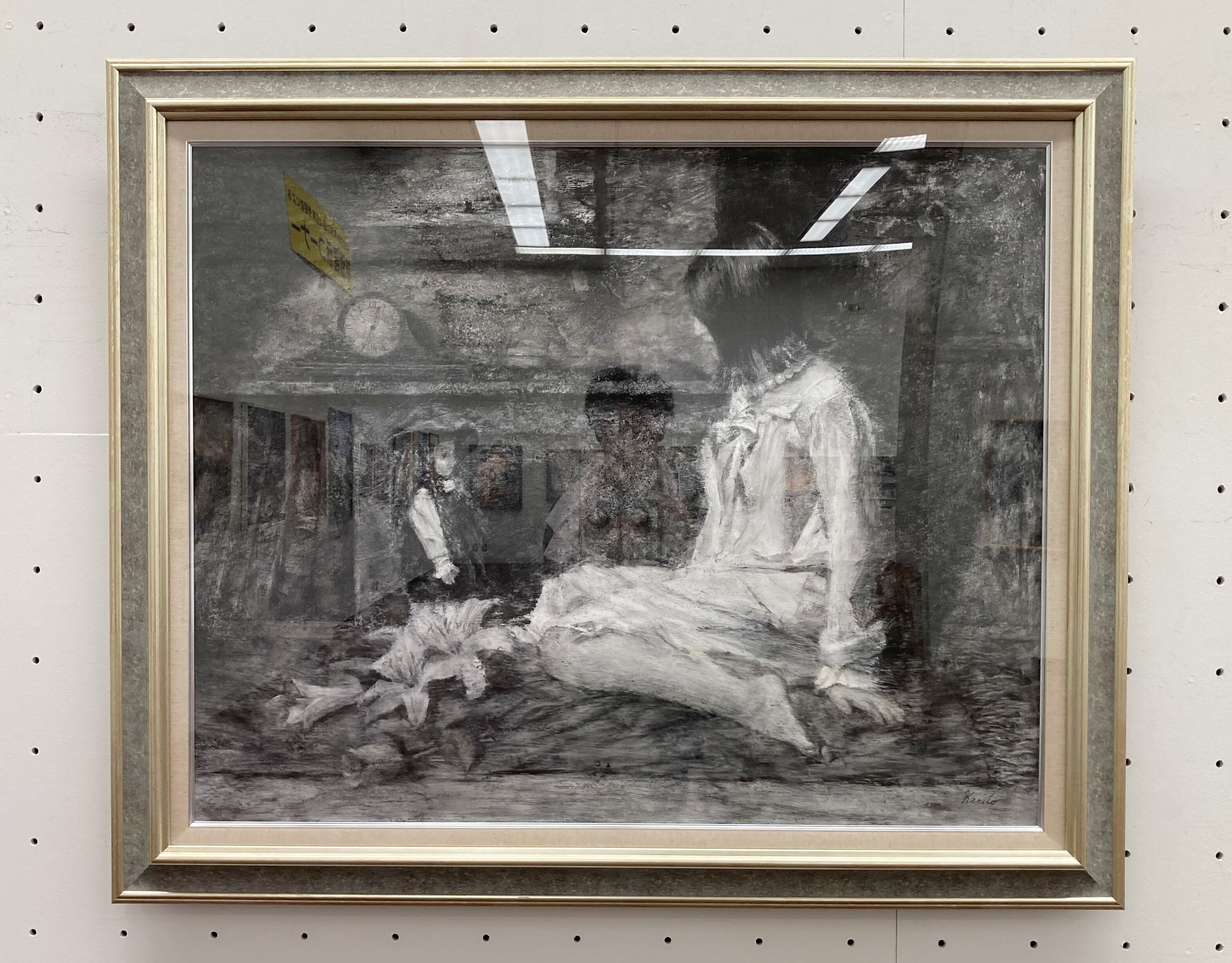 木炭で描いたモノクロ画ですが、夜遅く悩める女性が人形に何かを語っているシーンをイメージして制作しました。ザラザラした塗りによって幻想的な雰囲気になり、また天然の木炭ならではの少し茶色がかった黒によって温かみも感じます。