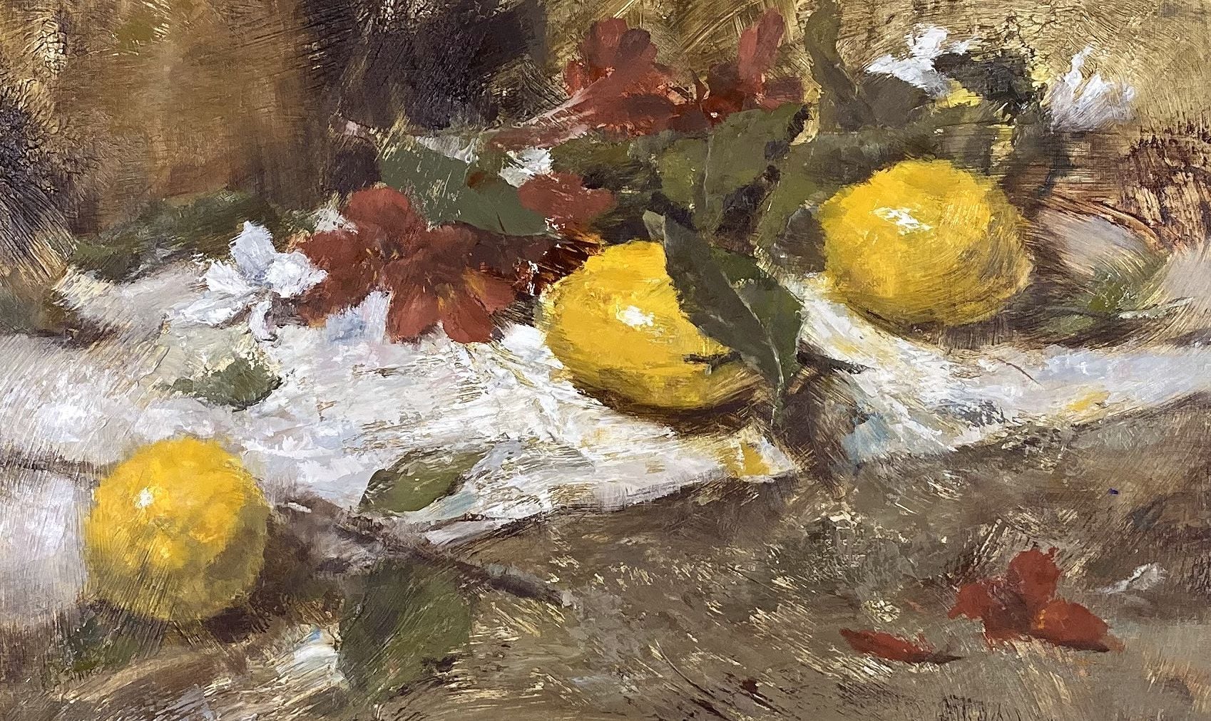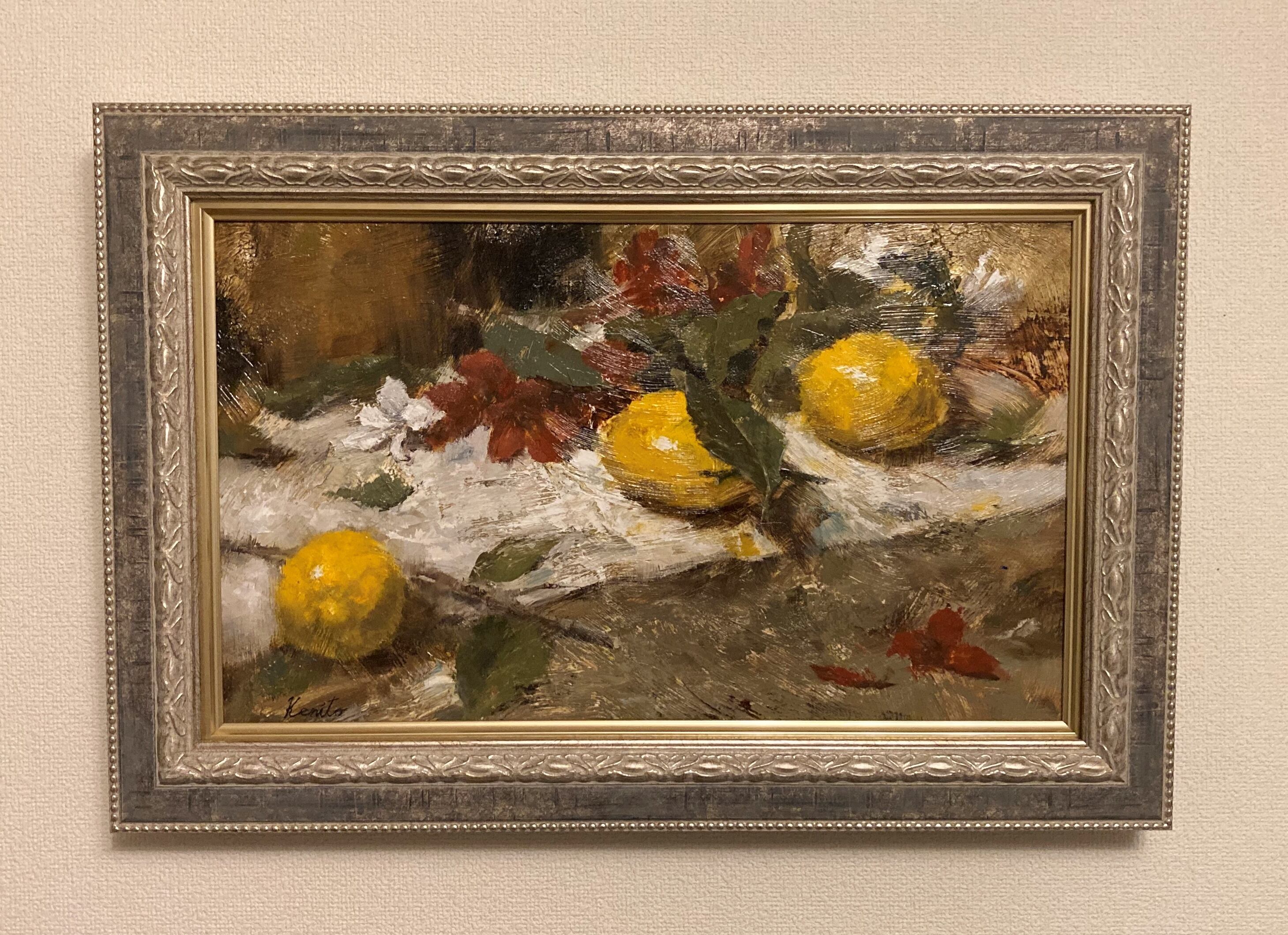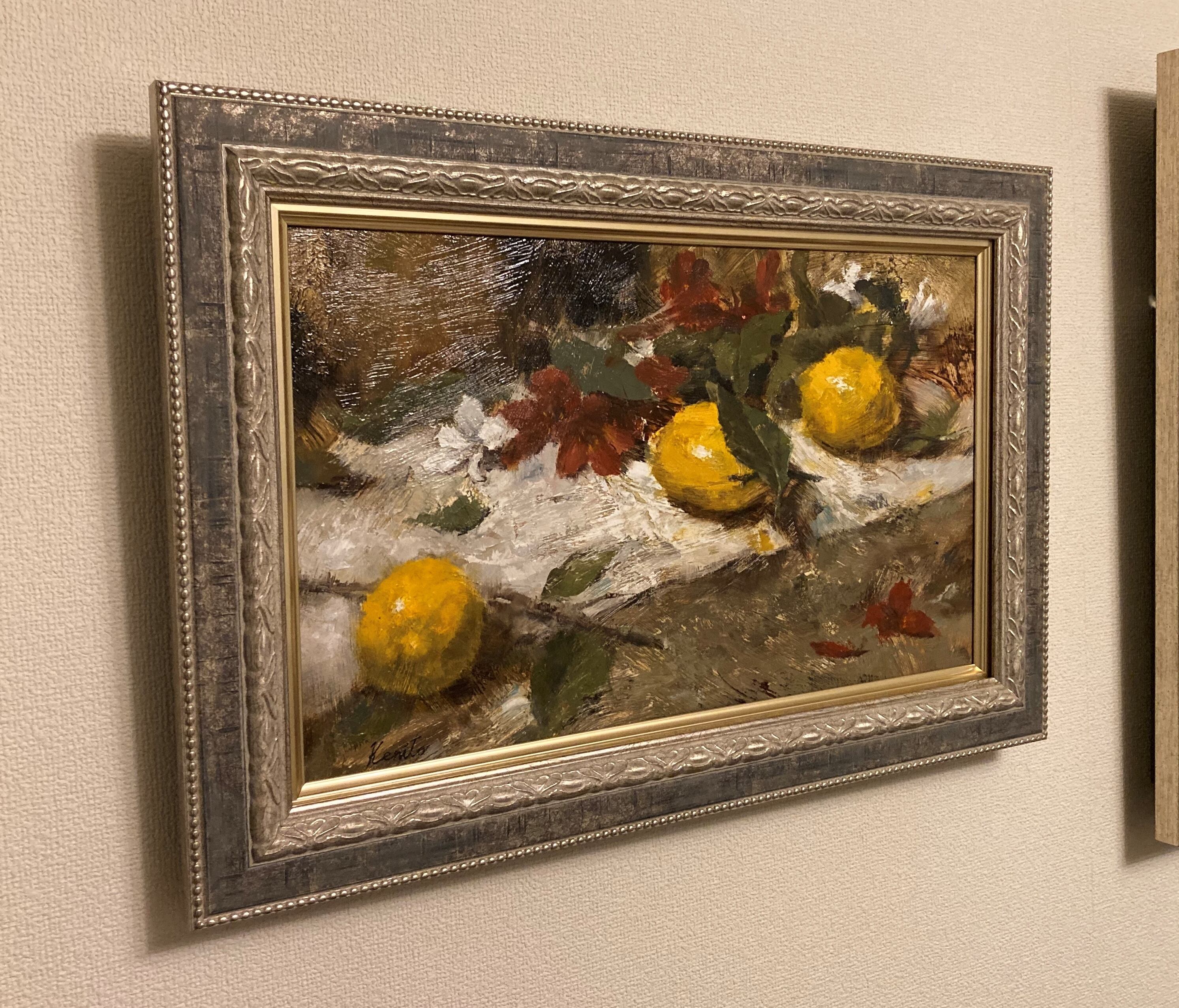庭に生っていたレモンを頂いたので絵にしました。お店で買うレモンとは違い、葉も付いていて自然を感じながら制作することができました。この作品はかなり粗い下地を作ってから描いたので表面に凹凸があります。その効果もお楽しみいただければと思います。