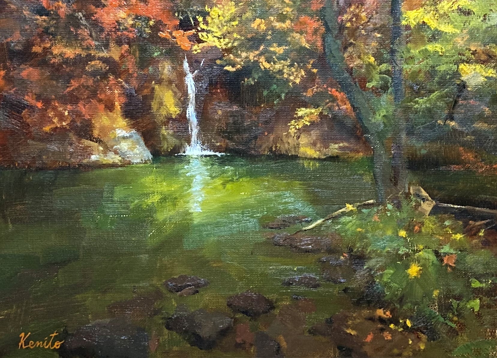 秋の美しい葉の色と遠くに見える滝が見所の作品となっています。密度のある画面上方と空間のある前景のバランスで見やすい絵になりました。額装なしとなりますがそのままお飾りしても日常に溶け込む雰囲気の作品です。